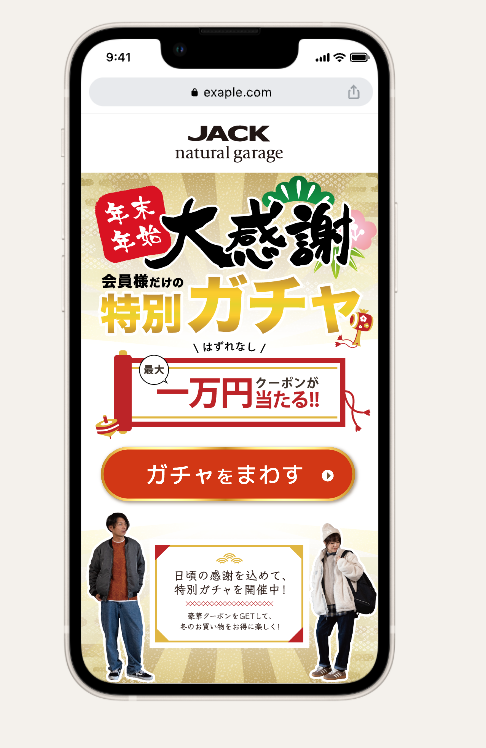 | 実行施策 | ・LINE×店頭導線で参加できる クーポンガチャ施策 を実施(ブラックフライデー/年末年始 ・店頭ではレジでの声かけを軸に、「その場で回して、その場で値引き」できる体験を設計 ・年末年始は 店内掲示(試着室ポップ等)を強化 し、会計前の参加も促進 ・結果画面では「大当たり」などの当選事実のみを伝え、あえてクーポン詳細は伏せる設計へと改善(年末年始) |