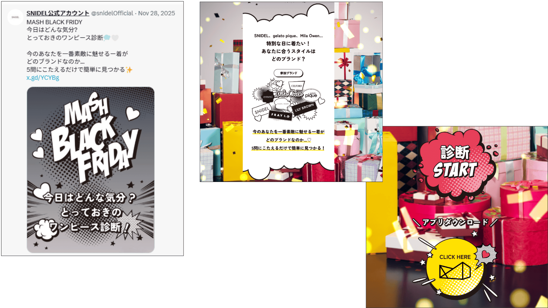 | 実行施策 | 今日はどんな気分?とっておきのワンピース診断! 診断体験 → 結果ページで「ブランド&商品」提示 → 商品ページへ誘導/SNS告知はX中心(ブランドによりインスタストーリーズ等) |