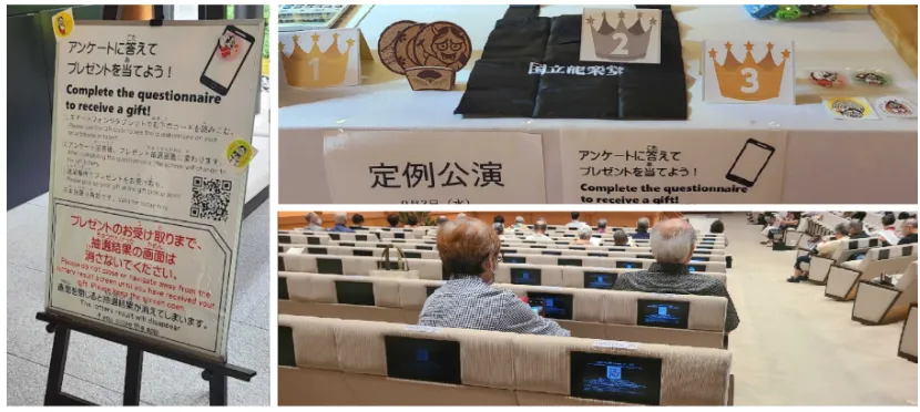 アンケートは、公演の場内アナウンスで周知し、正面玄関・ロビー掲示・配布資料など、複数導線にQRコードを設置。