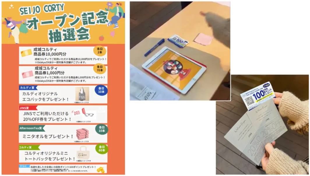 景品は施設内の協力店舗から提供された割引券やノベルティに加え、